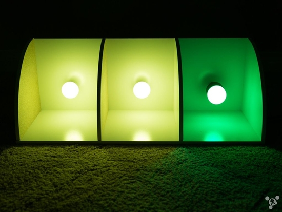 另外,对于色准这个智能灯泡普遍苦手的问题,Hue2.0的表现只能说是达到平均水准。Hue2.0在表现红色和黄色时很准确,但却很难还原生动的蓝色和绿色。在这方面,不得不说Hue2.0的表现并不比Hue好。上图是灯光颜色对比,从左至右分别是Hue、Hue 2.0和作为参照物的绿色LED灯泡,我们明显可以看出两款Hue灯泡的所谓绿色都偏黄。