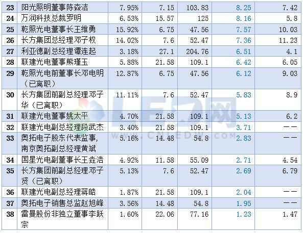 注:1.表中“股东身价前”表示按2015年4月7日相应企业股价(部分企业当日停牌则按停牌前一天的股价)及当时股东所持股份折算后的价值,“股东身价后”表示按2016年5月9日相应企业股价(部分企业当日停牌则按停牌前一天的股价)及当时股东所持股份折算后的价值;2.“——”表示此前未在统计之列;3.以上排名只收录了LED圈上市公司部分高管的身价,且表格中所述身价仅仅指高管们在所在公司的持股数按股价折算后的价值,不包括其他资产。