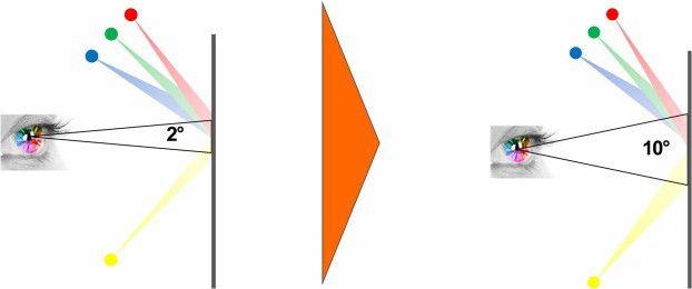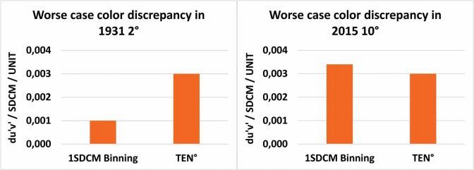 简单的来说2°的概念是以人眼在0.5公尺距离下观察20mm的色盘的景象,而10°看出去的状态约当于人眼在0.5公尺距离下所看到的90mm的色盘。两者之间还是会有些许的颜色落差存在。这两者之间的差别在于10°Binning技术更贴近现实生活的视觉体验。