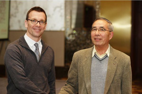 欧司朗光电半导体的固态照明市场总监Michael Schmitt(左)与复旦大学周太明教授(右)。
