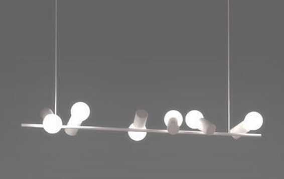 这是中国设计师刘知礼的作品“鸟”,他用了最普通的电木吊灯头,微微向上扬,然后装上白色的灯泡,似乎是一只小鸟站立的状态。有的像是在鸟笼里,有的像是停在了电线上,还有的像是聚集在一起。当多盏灯挂在一起时,能让光线也显得柔和。这一系列的亮点就在用最基本的材料和并不复杂的形态创造一种单纯却有想象空间的意境。