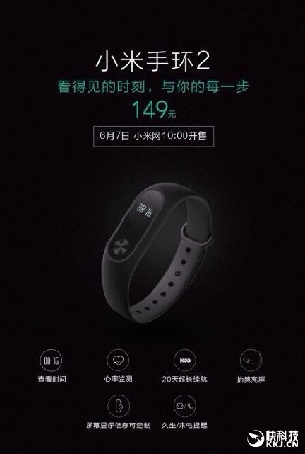 此前,雷军在小米无人机直播发布会上,已经确认小米手环2将于6月2日正式发布,6月7日首发开卖。现在,其售价已经提前曝光。