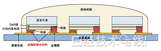 不过,以往在进行倒装芯片键合时,必须在基板上使用昂贵的氮化铝。这是因为价格低廉的金属基板与LED芯片的热膨胀系数存在很大差异,接合处容易破损。而在此次的技术中,作为接合材料的AuRoFUSE含有金颗粒,这些金颗粒可缓和热膨胀时的变形,因此可使用价格低廉的金属基板。凭借这一技术,便可实现LED模块的高输出功率化和小型化。