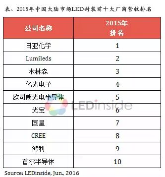 台系厂商亿光于中国大陆市场成功发展车用、小间距显示屏与闪光灯市场,排名第四。欧司朗成功于中国大陆市场发展车用与红外线LED市场,排名进入第五。国星光电因发展小间距显示屏应用市场有成,排名有所提升。鸿利光电因合并斯迈得公司营收,得以取代荣创(AOT)首次进入前十。