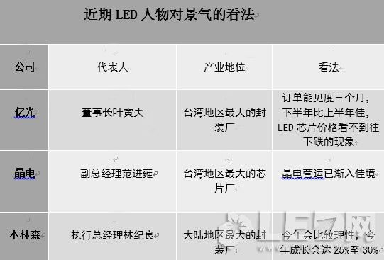 亿光董事长叶寅夫看好下半年LED产业景气后,大陆最大LED封装厂木林森执行总经理林纪良7月10日也对下半年LED景气审慎乐观,今年木林森业绩要成长三成。晶电营业市场行销中心副总经理范进雍表示,晶电营运在产品结构调整下,已渐入佳境,大幅改善亏损。