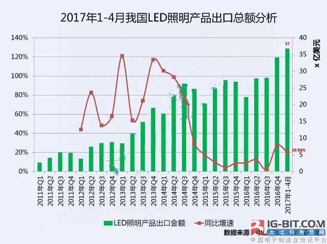 2017年前四个月,我国LED照明产品的出口总额达36.8亿美元,同比增长19.94%,增长稳重上升。