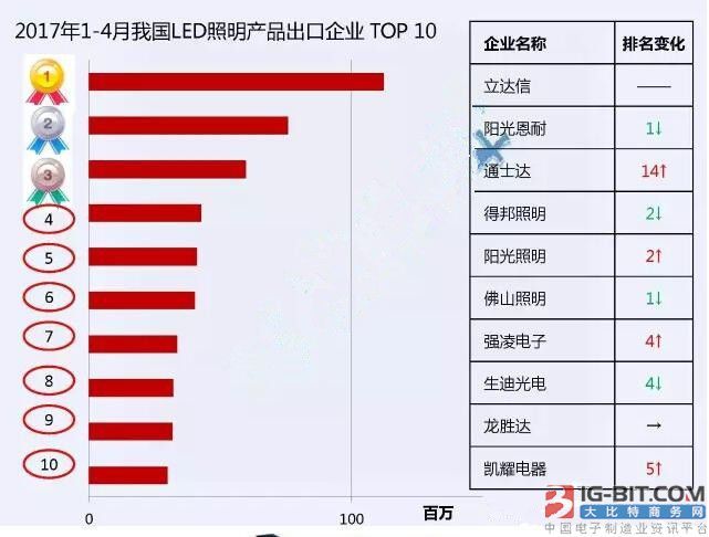 不过,中国企业的出口额在全球占比相对较低。2017年前四个月我国LED照明产品出口企业8996家,排名前30的企业出口总额为10.07亿美元,占比只有27.36%。