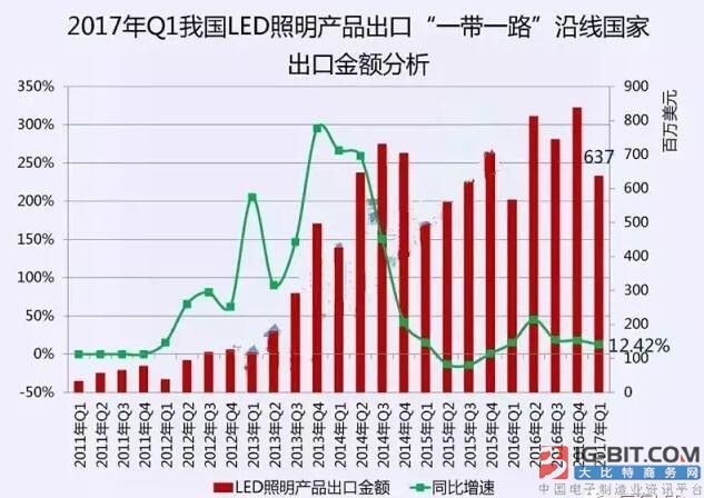“一带一路”庞大的需求市场显然已经成为LED企业下一步应当加大、加快布局的区域,但这个市场LED照明需求规模有多大?根据报道,2017年一季度,我国LED照明产品出口64个“一带一路”沿线国家总金额达6.37亿美元,较2016年同期增长了12.42%,占LED出口市场的24.3%。